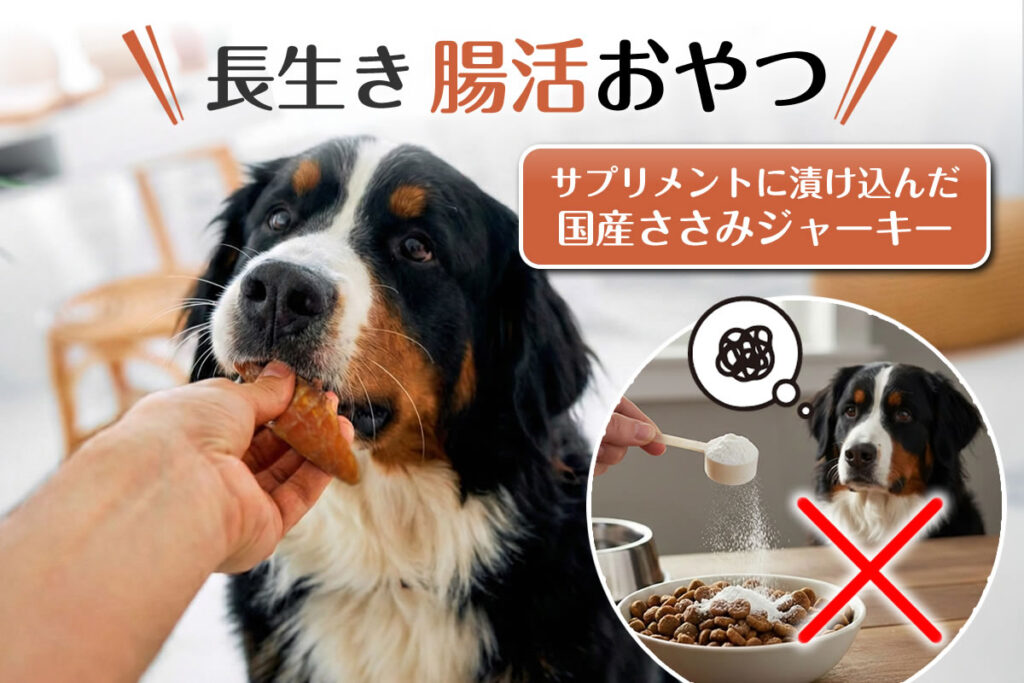 完成したのは「短鎖脂肪酸と野草酵素」にじっくり漬け込んだ国産100%の「ささみジャーキー」です。添加物や防腐剤を一切使わず、毎日のおやつで美味しく楽しみながら、愛犬の免疫力をしっかりサポートします。